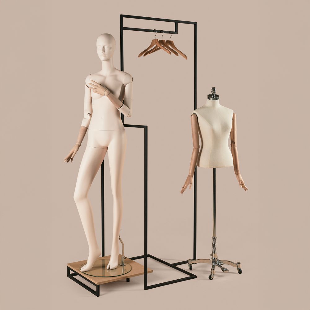 RA220 to kluczowy element systemu – rama, która pełni rolę kreatywnego szkieletu całej konstrukcji. Może być używana samodzielnie lub w połączeniu z podestami o różnych wysokościach i manekinami - tak całopostaciowymi, jak i torsami, co pozwala tworzyć meble sklepowe dopasowane do indywidualnych potrzeb. Świetnie sprawdza się jako wieszak sklepowy lub ekspozytor dla dodatków i odzieży, czy nawet elementów wystroju wnętrz.