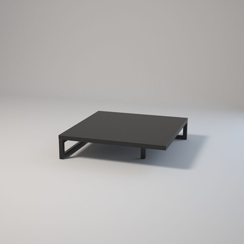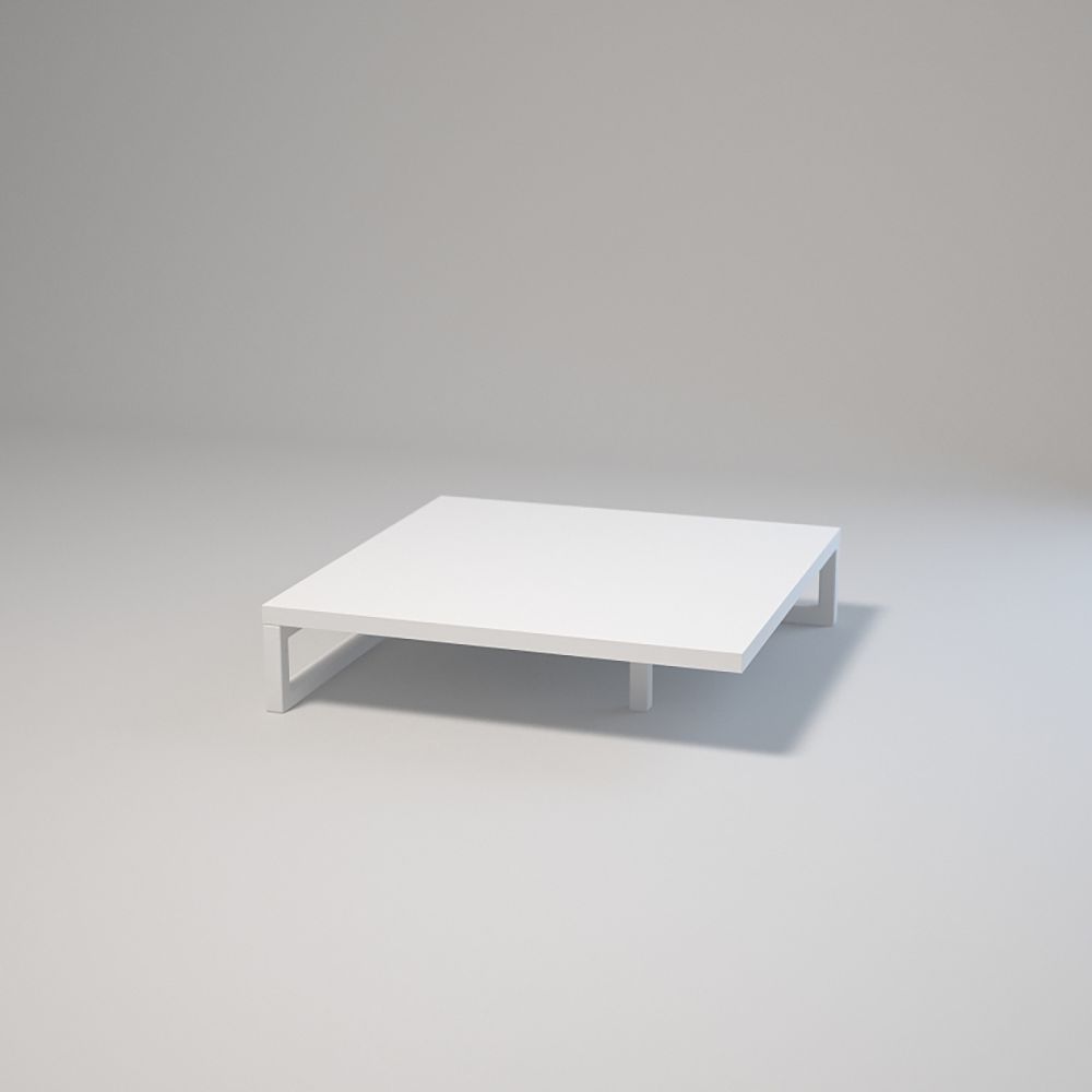 Wymiary 50x50 cm, wysokość 12 cm. Profile stalowe 20x20x1,5 mm, lakierowane proszkowo. Blaty z laminowanej płyty z obrzeżem. Montaż przy użyciu muf i śrub. Regulowane stopki meblowe z podstawą. Kolory: biały lub czarny.