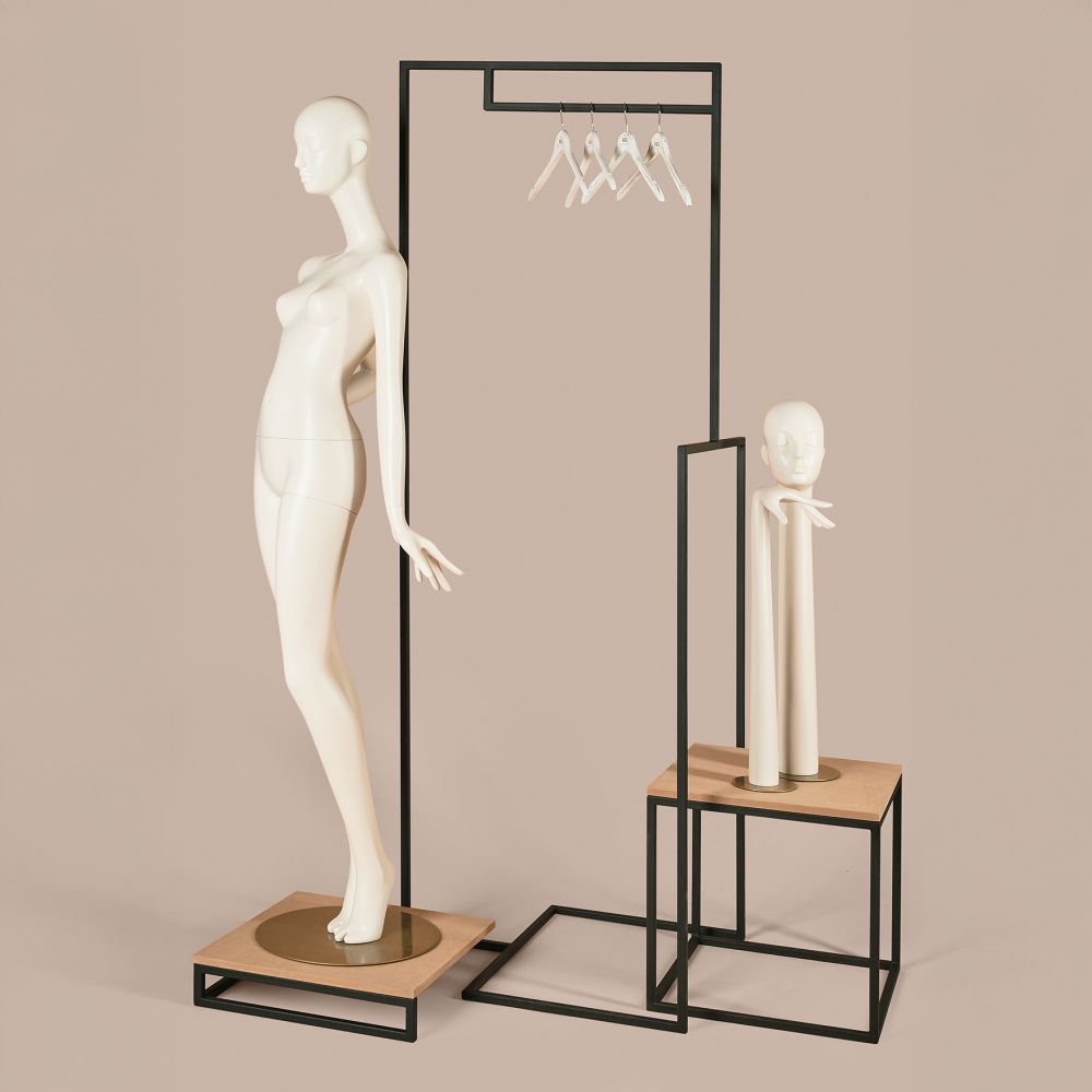 Model RA220 to uniwersalna rama, która stanowi podstawę w systemie ekspozycyjnym. Może być wykorzystywana samodzielnie lub jako element większej konstrukcji, łączony z podestami, torsami lub manekinami całopostaciowymi. Świetnie odnajduje się jako stojak sklepowy na ubrania, ekspozytor na akcesoria modowe czy nawet jako element dekoracyjny wnętrza. To rozwiązanie, które wspiera budowę spersonalizowanych mebli sklepowych i ekspozycji dostosowanych do zmieniających się potrzeb sprzedaży.