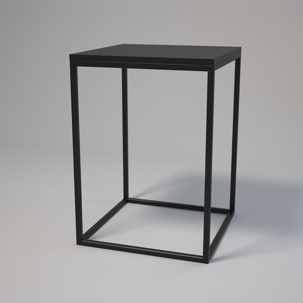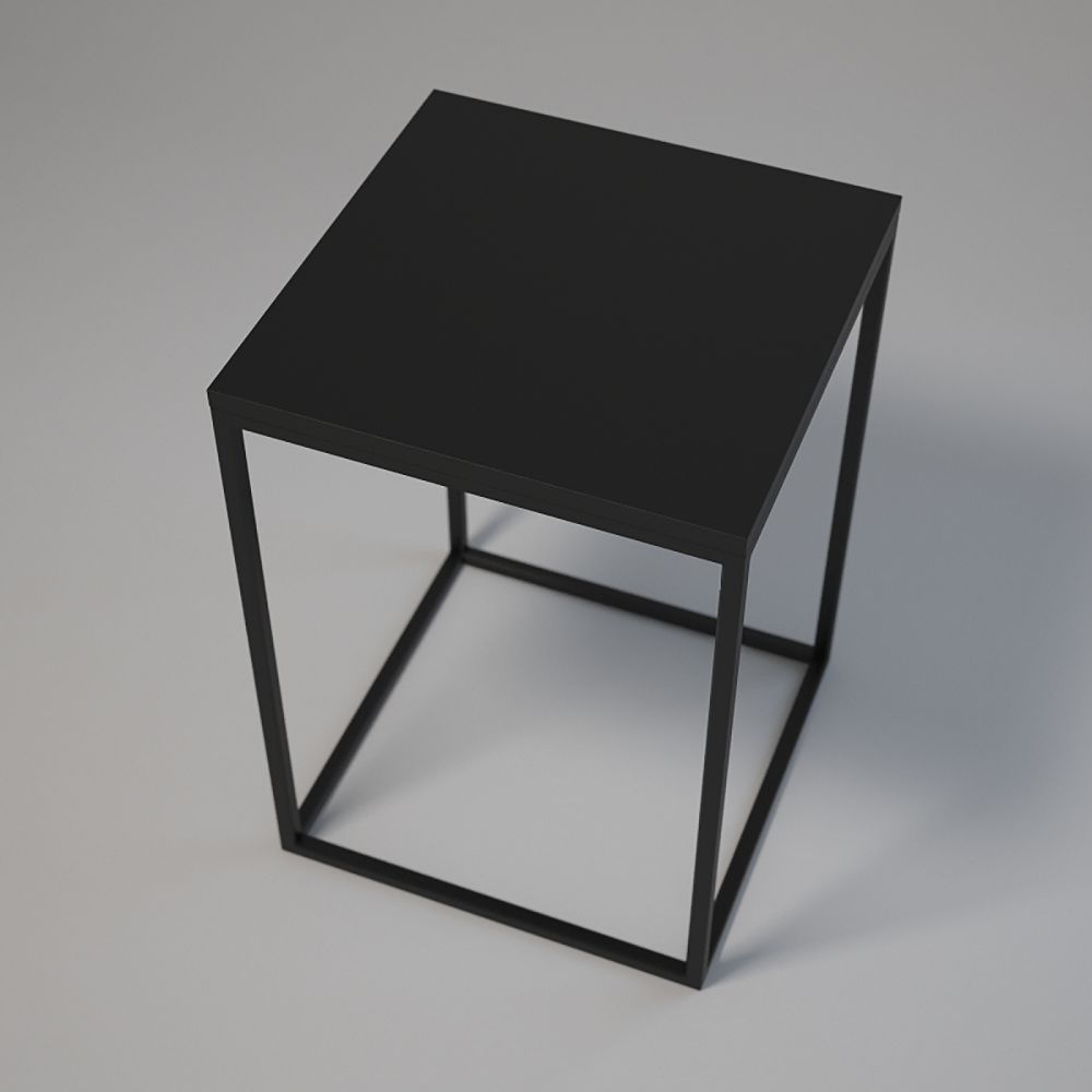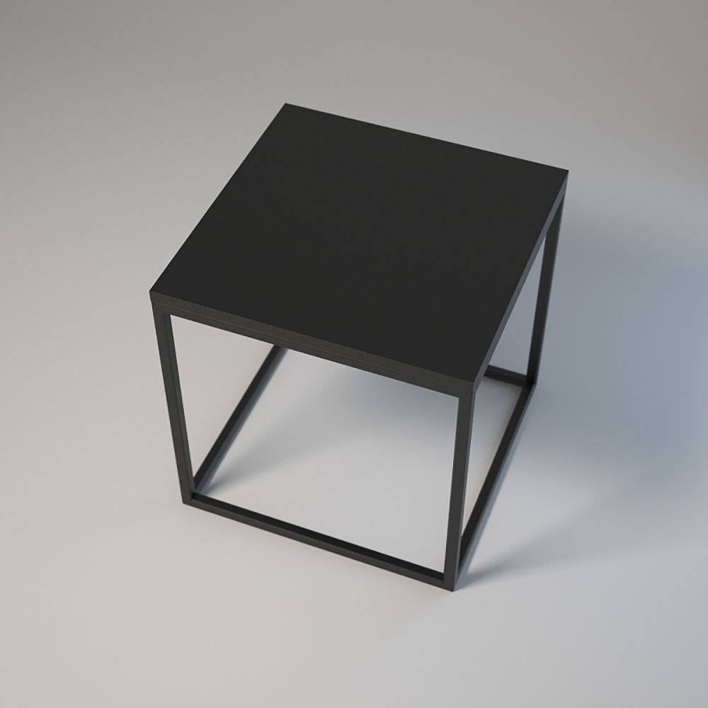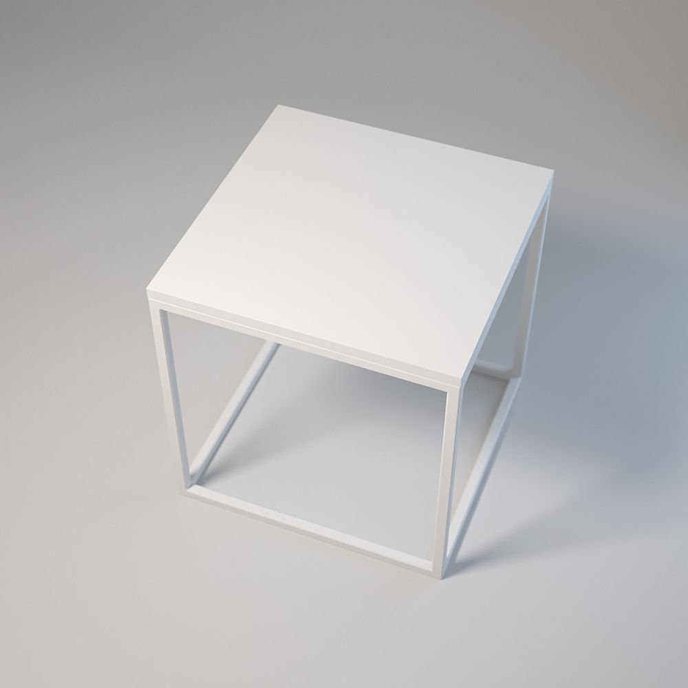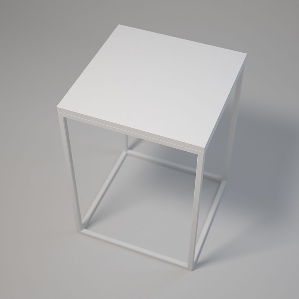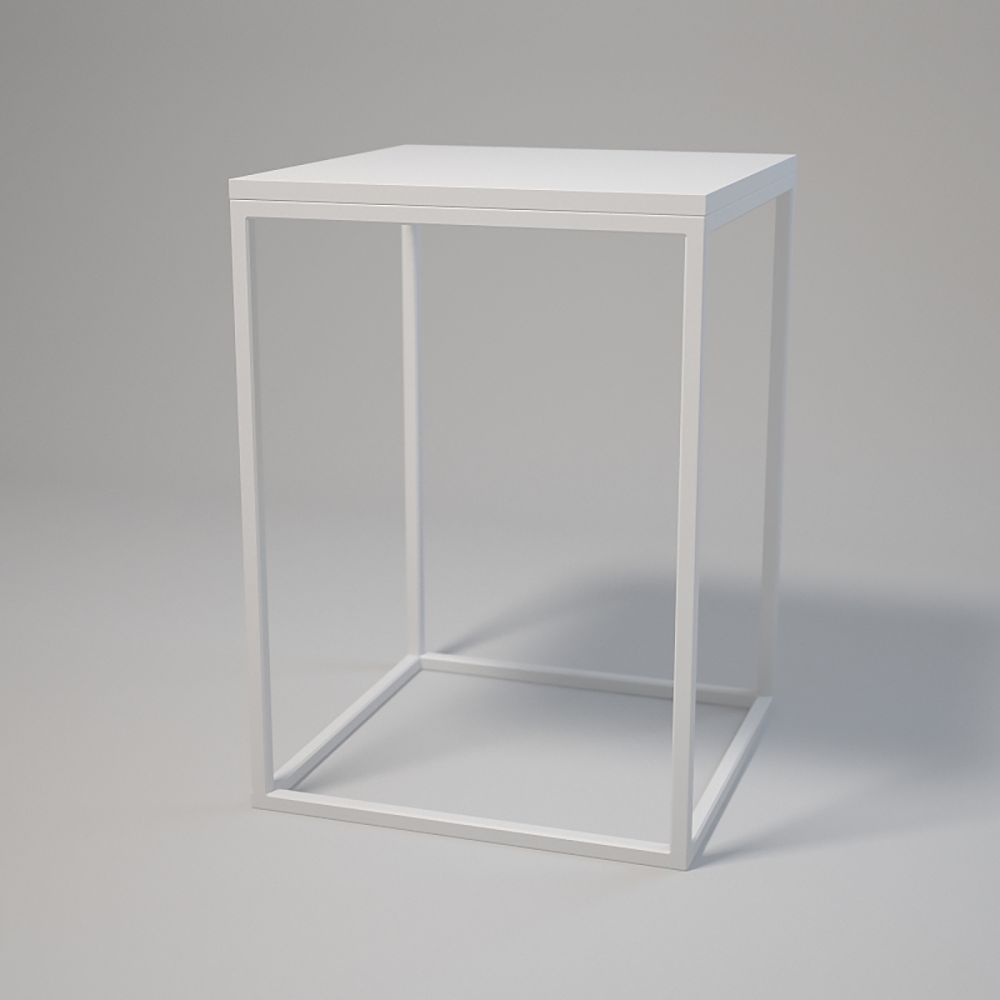 Wymiary 50x50 cm, wysokość 70 cm. Konstrukcja: stalowe profile 20x20x1,5 mm lakierowane proszkowo. Blat z płyty laminowanej z obrzeżem, montaż za pomocą muf i śrub. Regulowane stopki meblowe z podstawą. Kolor: biały lub czarny.
