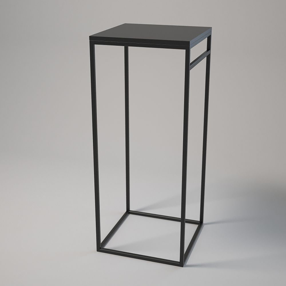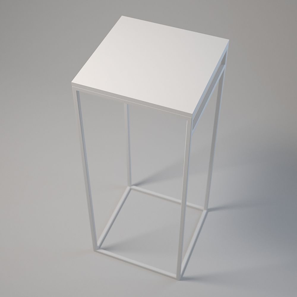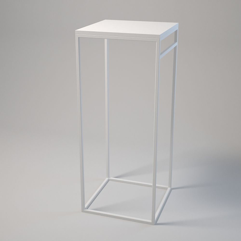 Podest 50x50 cm, wysokość 120 cm. Profile stalowe 20x20x1,5 mm, lakier proszkowy. Blat z laminowanej płyty z dopasowanym obrzeżem, montowany za pomocą muf i śrub. Regulowane stopki meblowe z podstawą. Kolory: biały lub czarny.