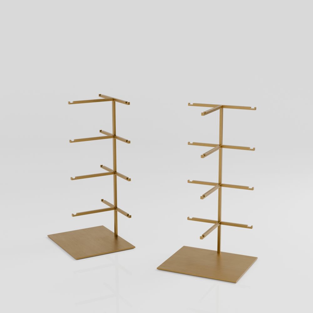 Model ES-GY-03-GB to poczwórny stojak na okulary zaprojektowany z myślą o efektywnej i estetycznej prezentacji kilku modeli jednocześnie. Minimalistyczny design, matowe wykończenie w szczotkowanym złocie oraz kompaktowe wymiary (11 × 15,5 × 26 cm) czynią go idealnym rozwiązaniem do butików, showroomów oraz przestrzeni typu pop-up.