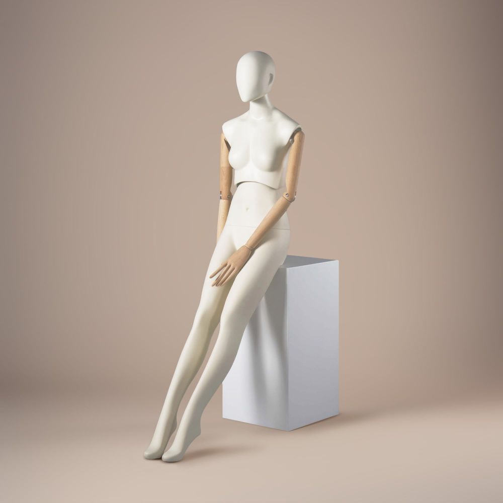 LUF2-A to stylowy damski manekin odzieżowy, stworzony z myślą o ekspozycjach premium. Dzięki nowoczesnej konstrukcji umożliwia pełną swobodę w aranżacji – jego tors można obracać i przechylać, co pozwala na dynamiczne prezentowanie kolekcji. Ruchoma głowa z regulacją kąta nachylenia oraz naturalne drewniane ramiona z precyzyjnie wyrzeźbionymi dłońmi nadają mu wyjątkowego charakteru. Wykończenie w odcieniu złamanej bieli RAL9010 sprawia, że idealnie komponuje się z nowoczesnymi butikami i przestrzeniami ekspozycyjnymi.