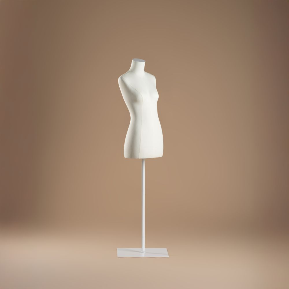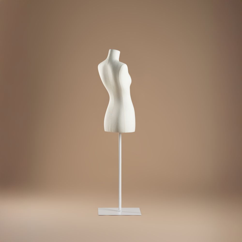 Damski manekin tors T-REF to połączenie klasycznej formy z nowoczesnym designem. Jego minimalistyczna konstrukcja, pozbawiona głowy i ramion, imituje tradycyjny damski tors krawiecki, podkreślając styl prezentowanej odzieży. Obszycie w odcieniu kości słoniowej nadaje mu elegancji i pozwala na estetyczne eksponowanie kolekcji.